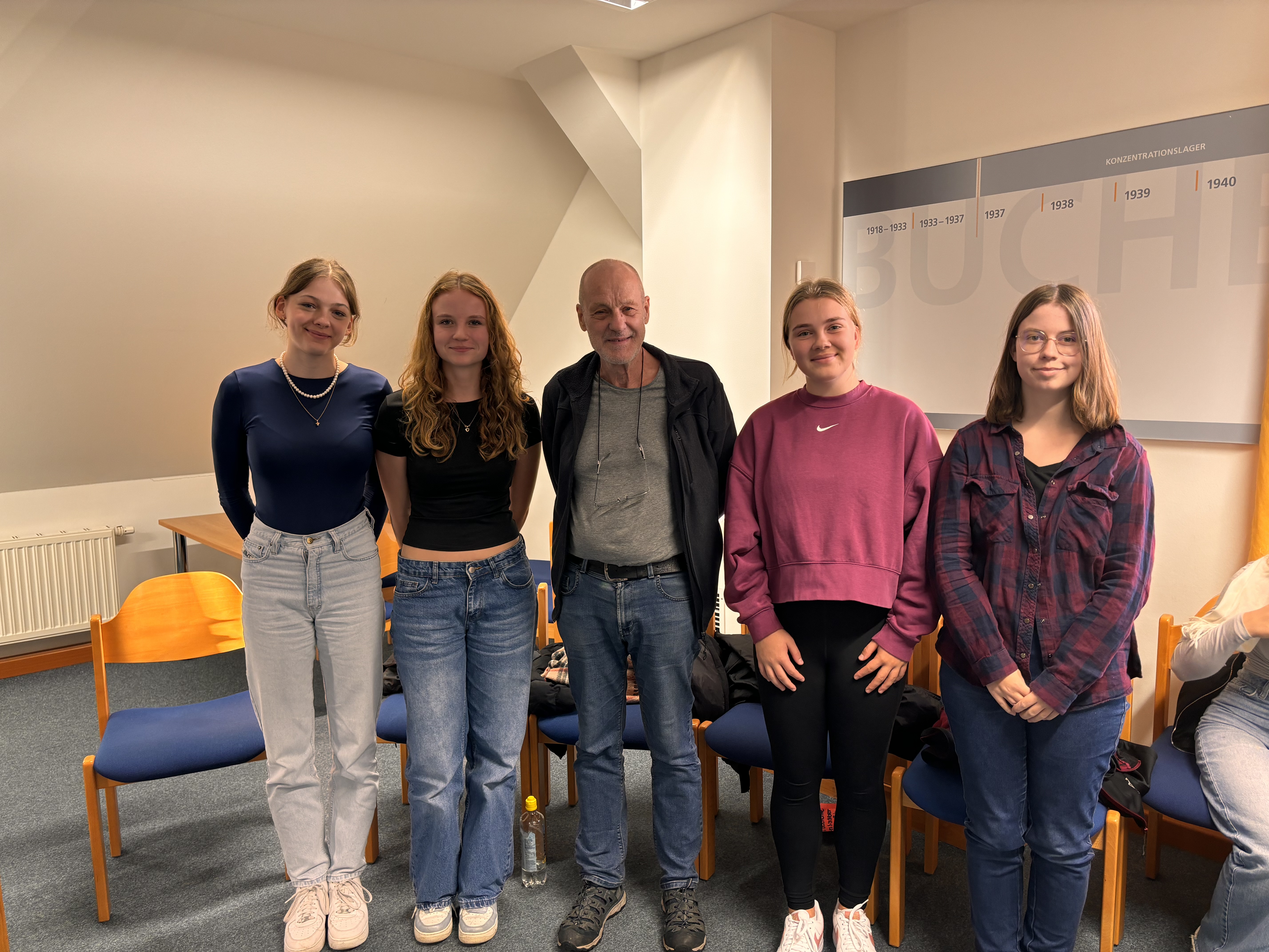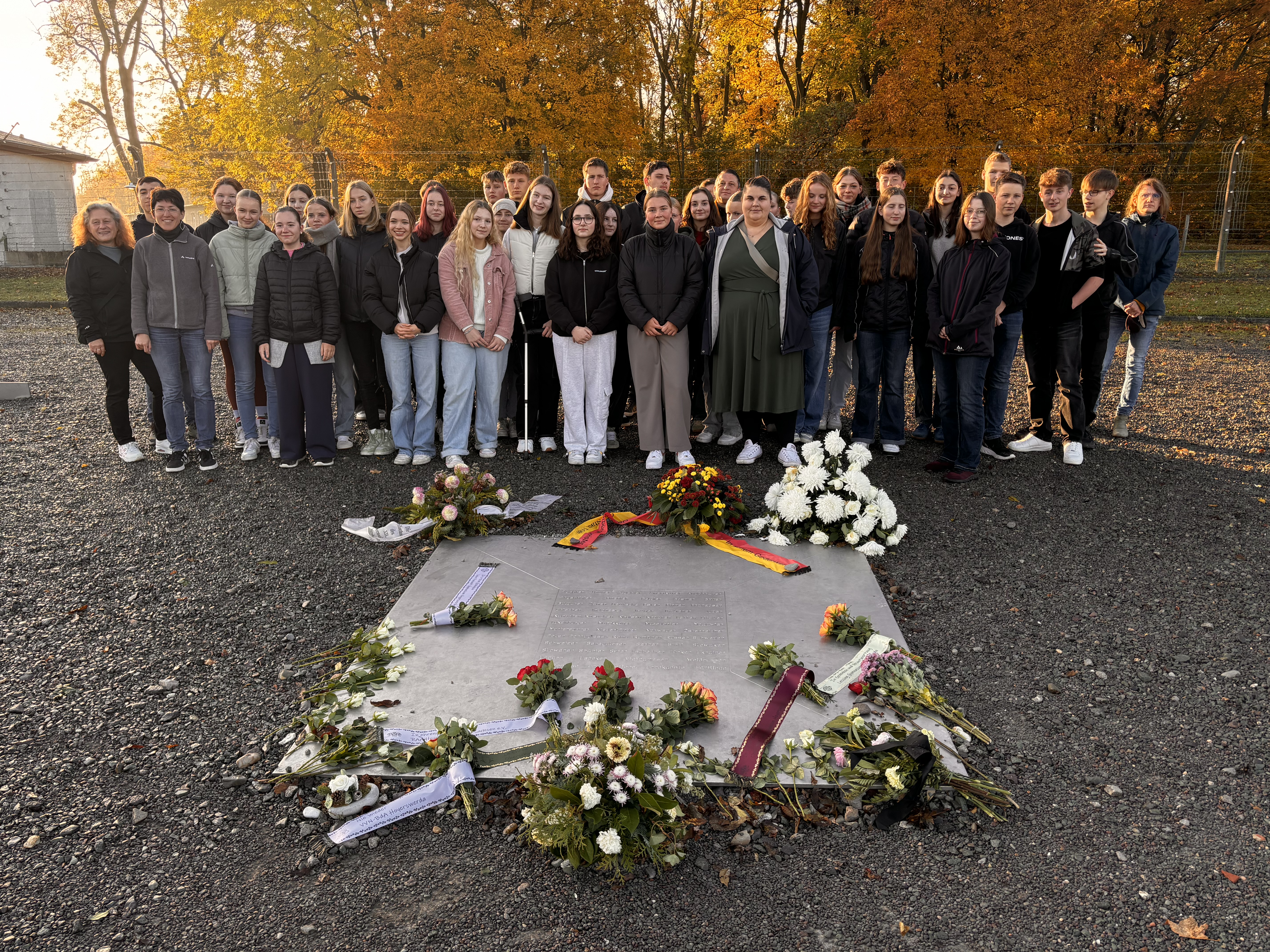 Vom 21.10.-23.10.24 besuchten einige ausgewählte Schüler unserer 10. Klassen das Konzentrationslager „Buchenwald“ und die damit kooperierende Jugendbegegnungsstätte. Ziel war es viele neue Einblicke zu sammeln und ihr Wissen über die Thematik des Holocaust und der Zwangsarbeit deutlich zu erweitern. Der Montag startete mit einer 4-stündigen Busfahrt und dem Beziehen der Zimmer. Danach gab es eine kurze Einführungsrunde. Hierbei wurden Bilder aus Täter- und Opferperspektive ausgelegt und die Schüler sollten ihre Gedanken und Fragen dazu äußern. Viele dieser Gedanken und Fragen sollten sich in den nächsten Tagen bestätigen bzw. klären. Kurze Zeit später gab es eine Führung durch das Gelände, wodurch viele der Schüler sich in die grausame Geschichte diesen Ortes, hineinversetzen konnten. Am nächsten Morgen wurde der Film „KZ Buchenwald - Post Weimar“ gespielt, welcher vor allem durch Gespräche mit Zeitzeugen interessant war. Im Anschluss gingen wir in das Museum der Gedenkstätte und konnten dort nochmal vertiefendes Wissen zur Geschichte des Lagers und Einzelschicksalen erlangen. Am Nachmittag bereiteten wir das Gespräch mit einem Zeitzeugen 2. Generation, also der Sohn eines ehemaligen Häftlings vor. Das Besondere daran war, dass wir das Gespräch selbst führen durften. Bei dem Gespräch wurden die Fragen der Schüler beantwortet und es konnte ein Einblick in eine der vielen persönlichen Geschichten gewonnen werden. Diese wurden von uns in kreativen Werken verarbeitet, die wir zum Zeitzeugentag im Januar präsentieren werden. Die Reise wurde mit dem Ablegen eines Blumenstraußes und einer anschließenden Schweigeminute für die Opfer dieses Ortes beendet und die Schüler konnten schlussendlich in den drei Tagen ein Stück Geschichte hautnah nachempfinden.
