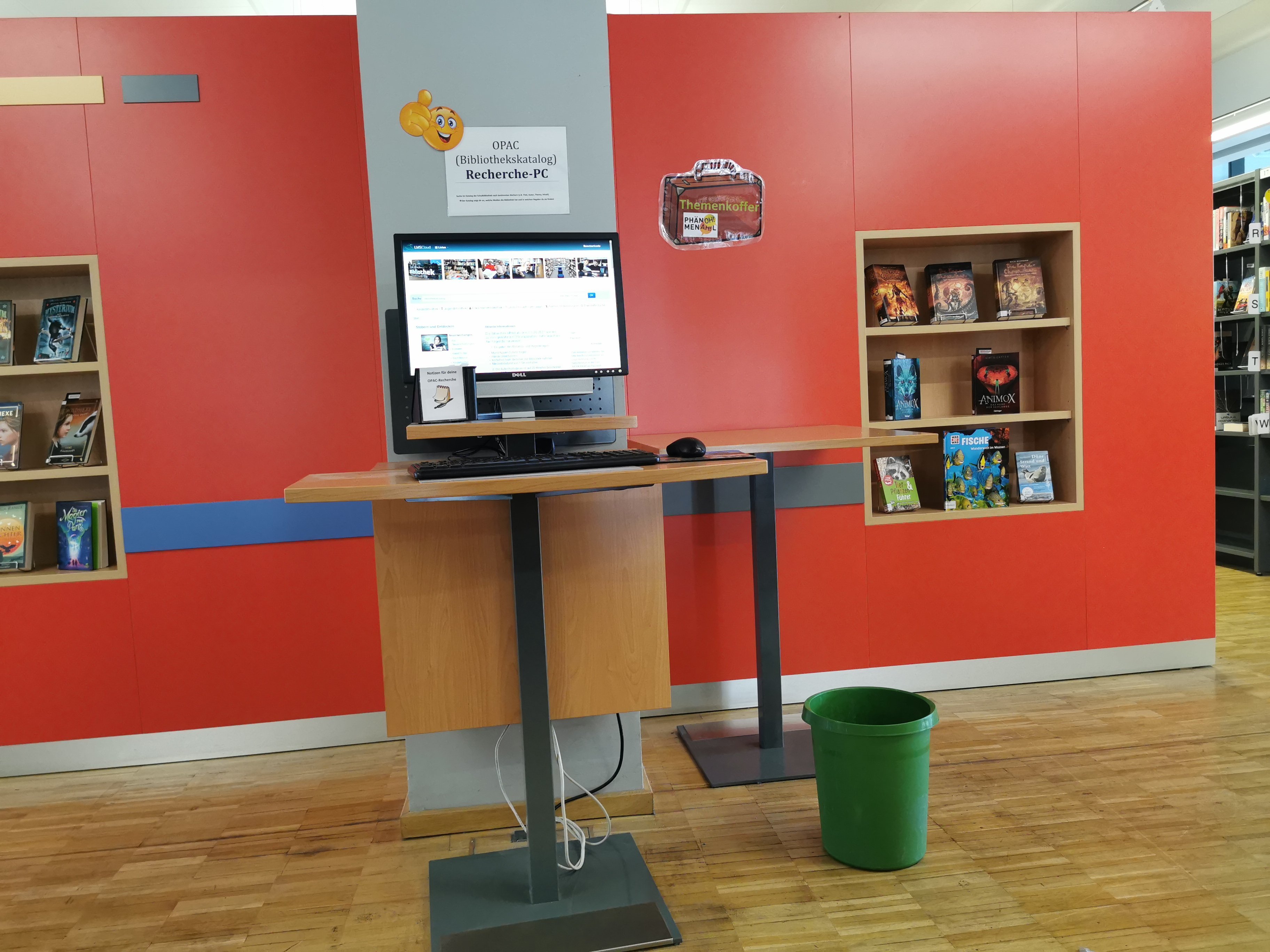 Gegenüber vom Eingang befindet sich der Computer zur Recherche im Bibliothekskatalog OPAC. Hier findet ihr alle Medien, die in der Schulbibliothek ausgeliehen werden können. Außerdem steht die Stadtbibliothek mit ihrem Online-Katalog zur Verfügung.